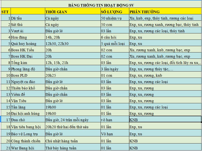 Đầu tiên là bảng thời gian các hoạt động tại JX Thiên Kiếm